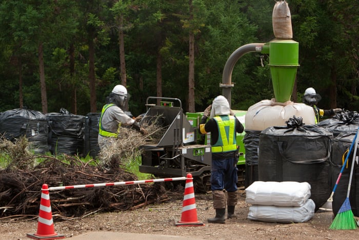 数千人の作業員たちが、林道沿いに10ないし20メートルの幅で汚染土壌と植物を除去している。